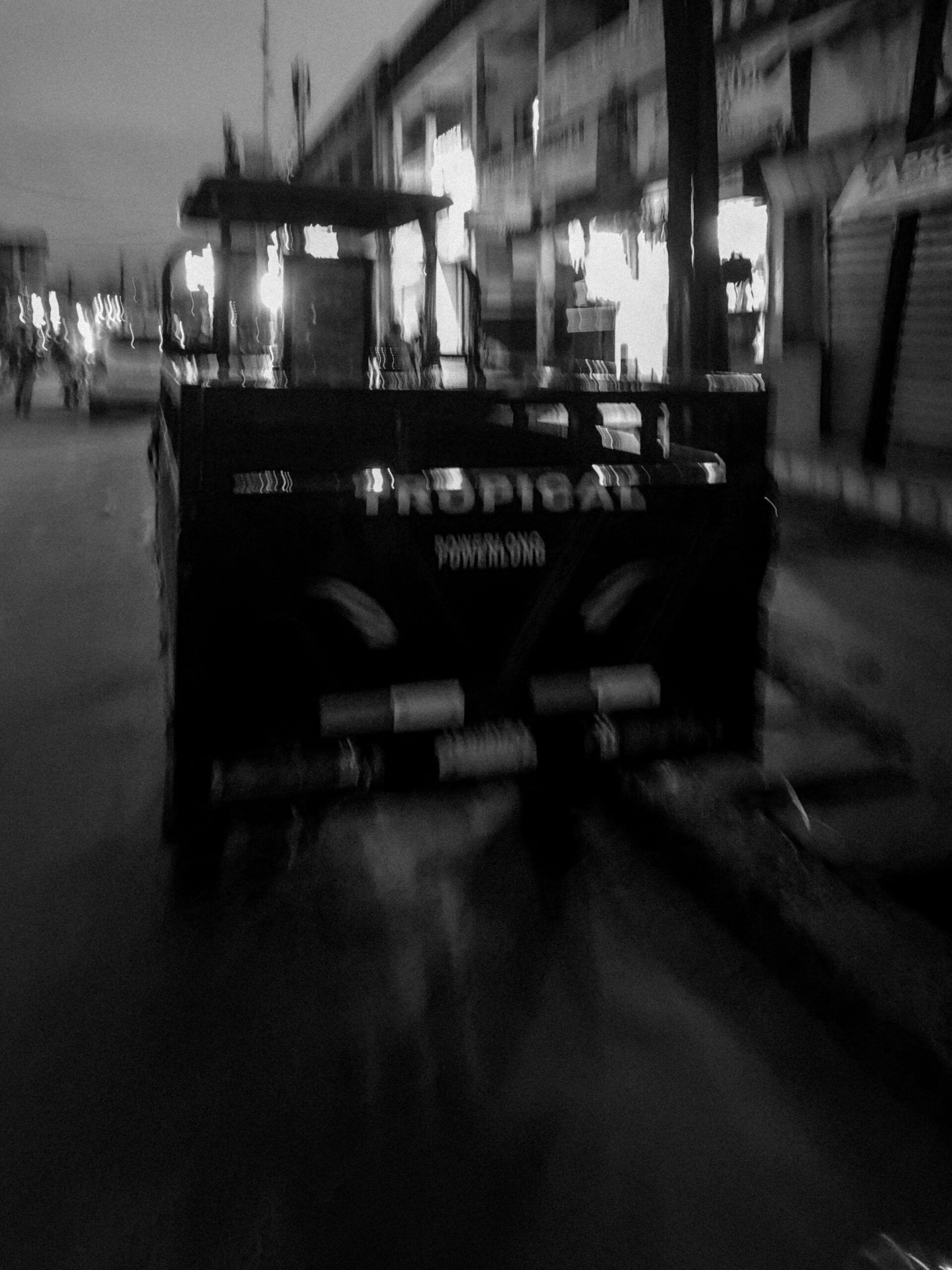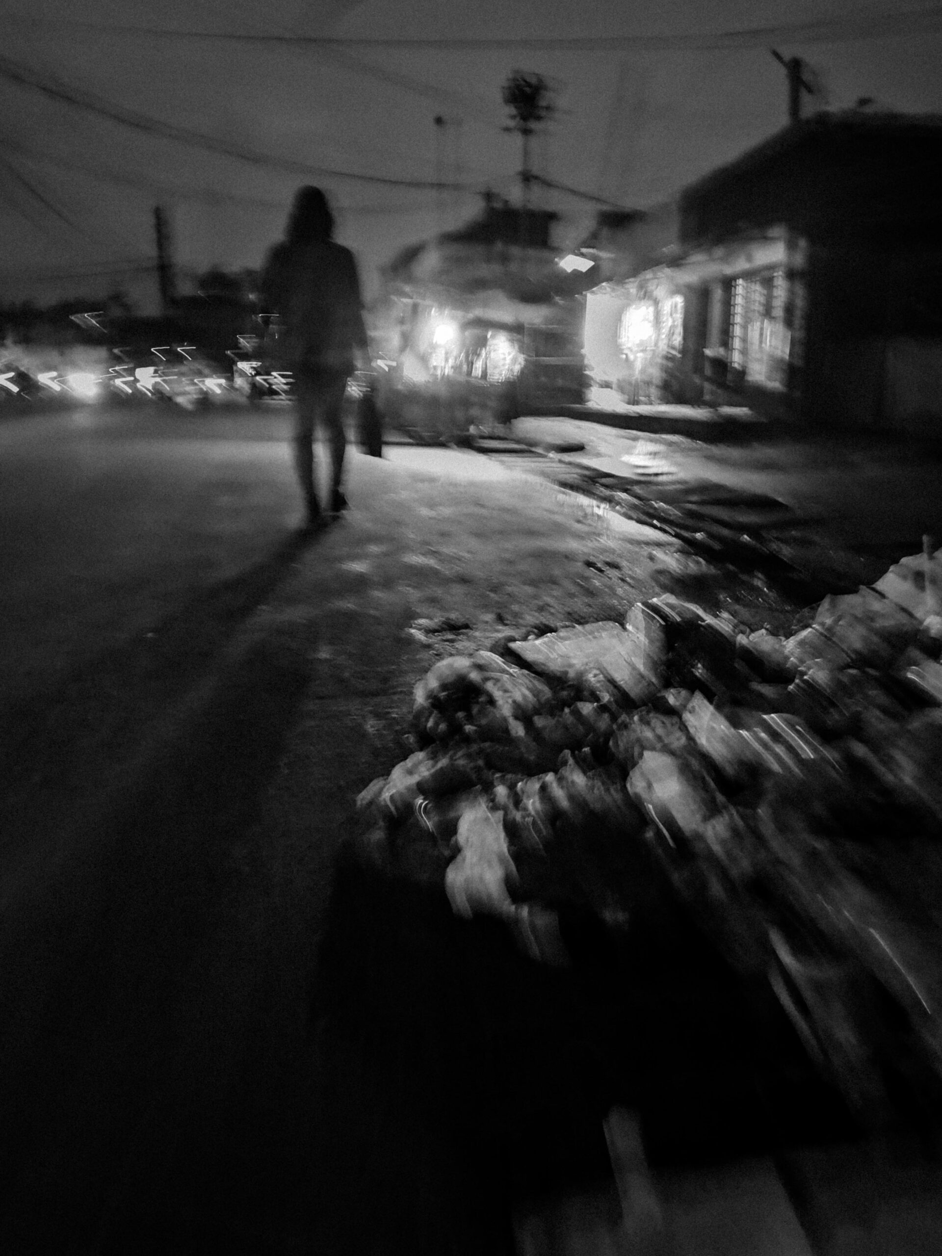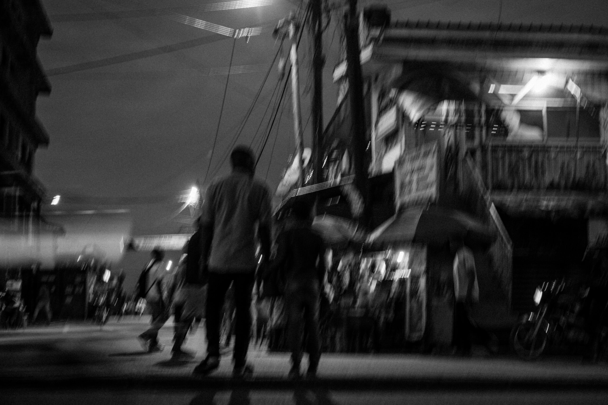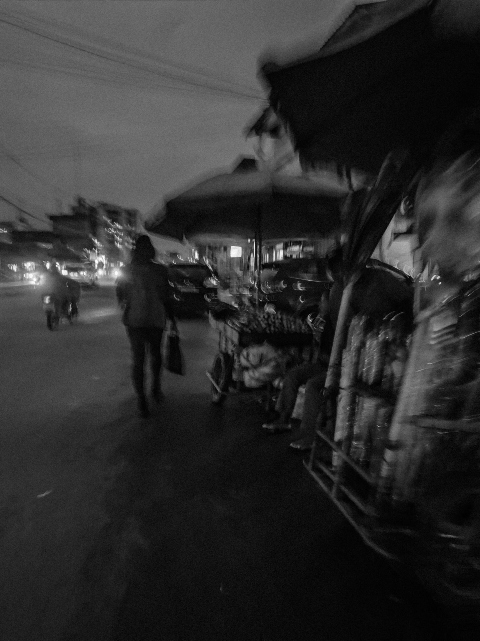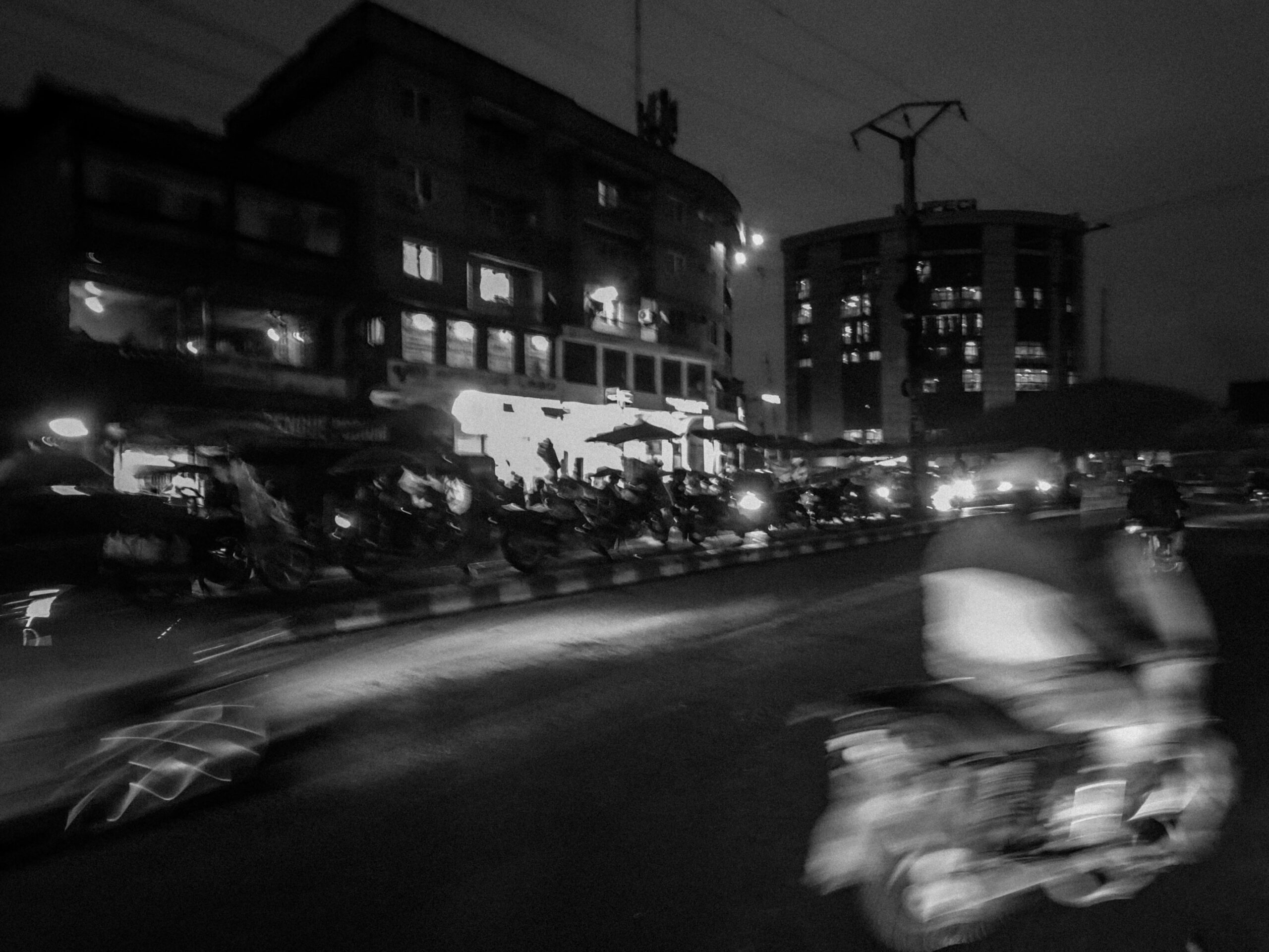 Les motos s’élancent dans des éclairs de phares, les enseignes des échoppes éclaboussent de lumière les trottoirs, et les passants avancent entre les ombres et les néons. Le bitume devient un miroir qui reflète des fragments de vie, des gestes furtifs, des attentes silencieuses. La ville, saturée de bruits et de mouvements, se livre aussi dans ses interstices : une silhouette qui traverse, un regard suspendu, une scène banale qui devient poésie visuelle.