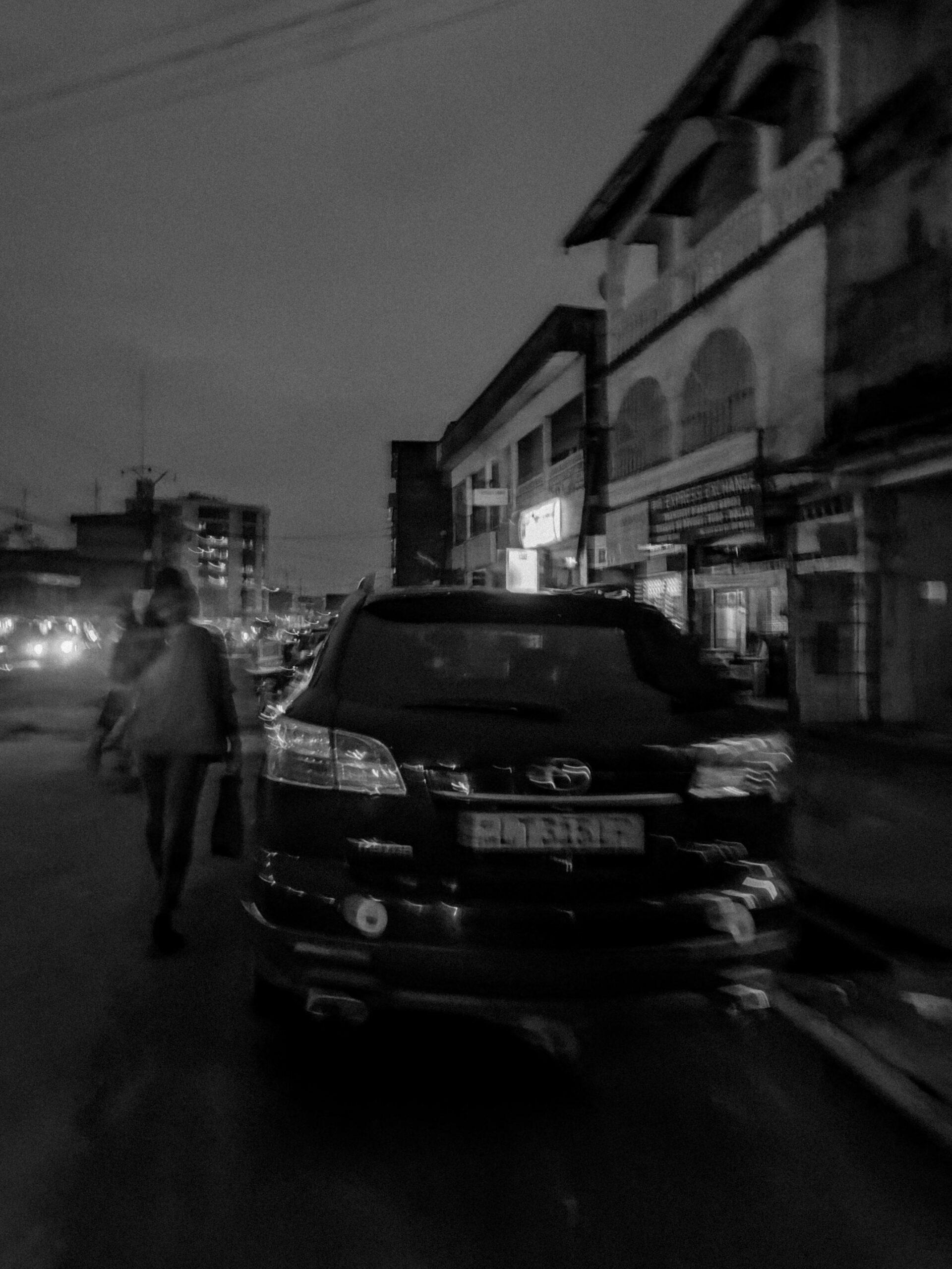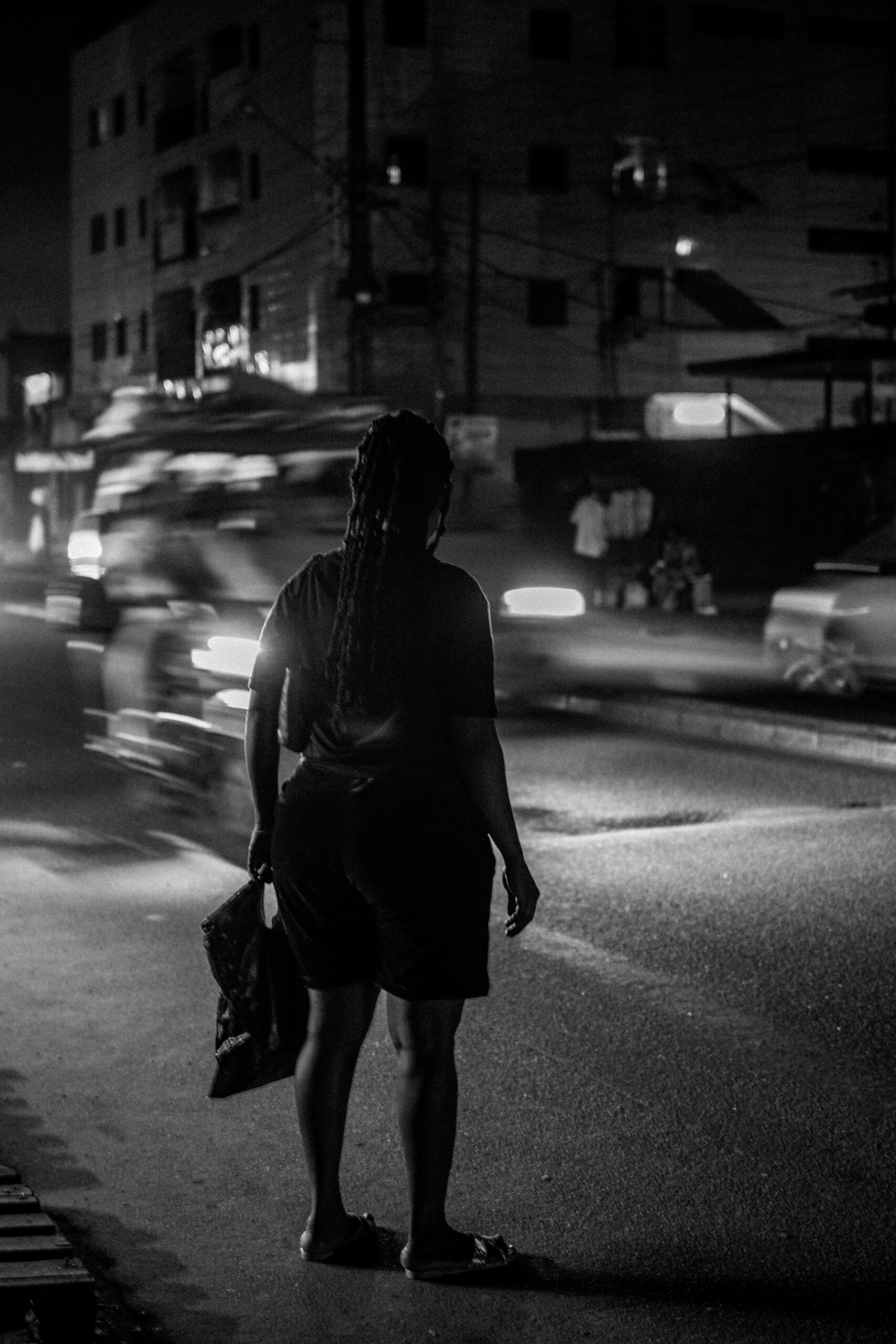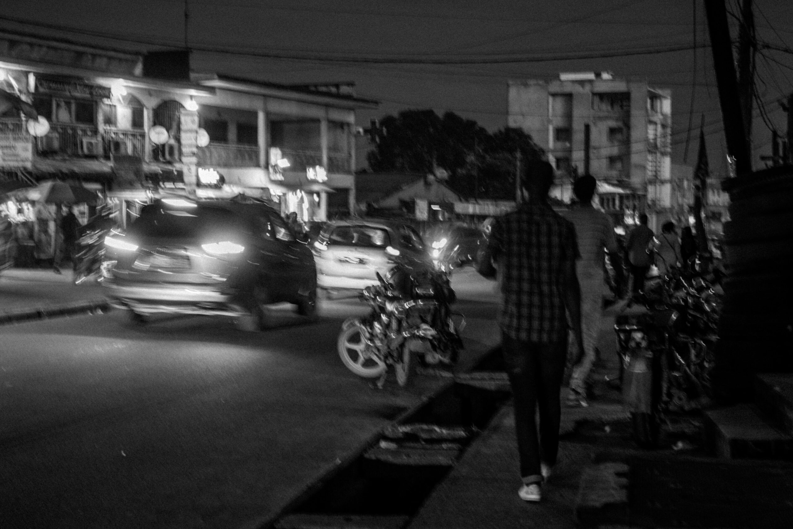 Les veines nocturnes, ce sont ces instants où tout vacille entre réalisme et abstraction. Le flou des mouvements raconte la vitesse et la fatigue, la lumière brutale révèle l’énergie de la nuit, et les ombres épaisses suggèrent la part invisible de la ville. Tel est le quotidien nocturne de Douala — vibrant, chaotique, mais toujours habité d’une mélancolie discrète.