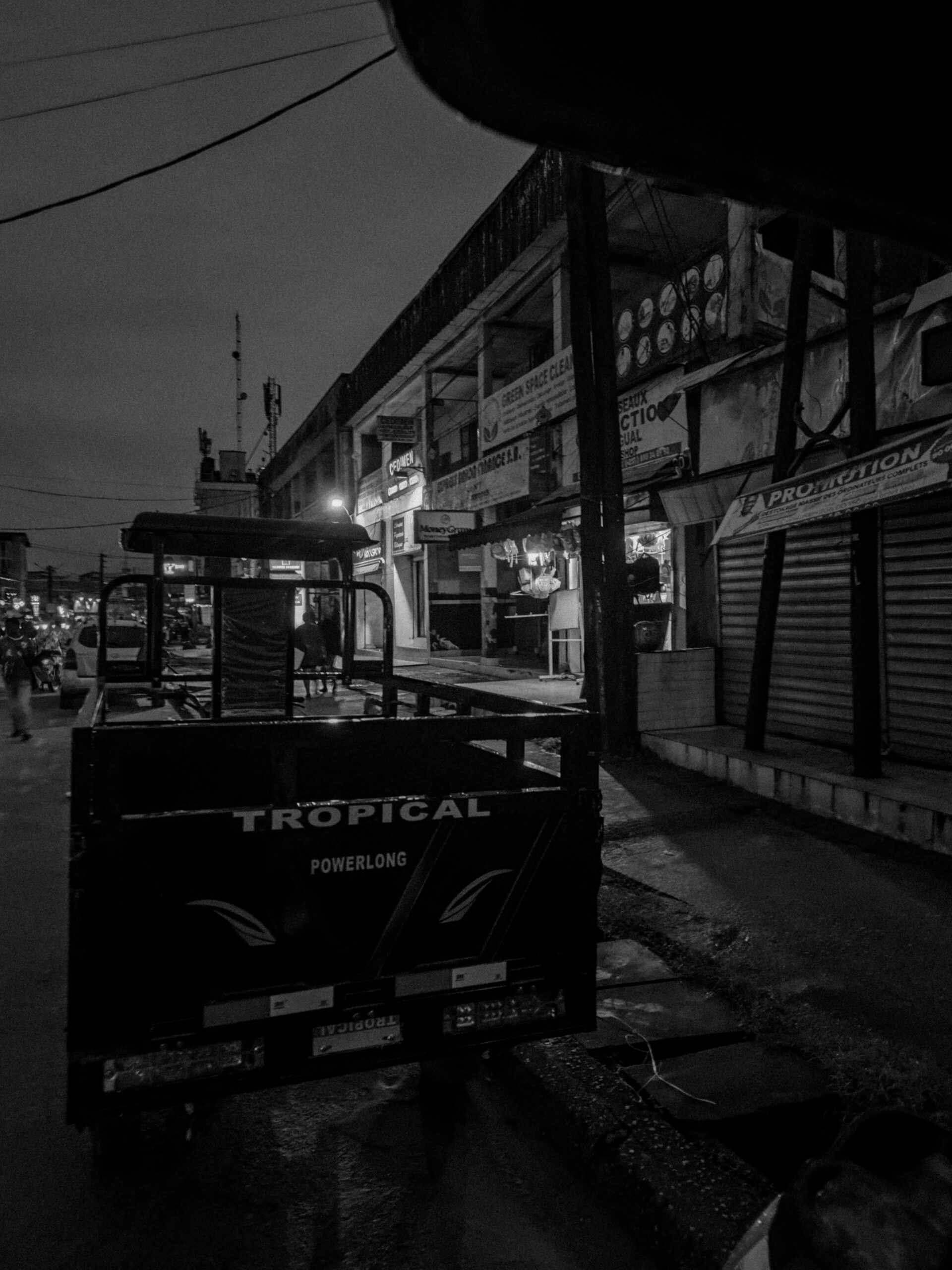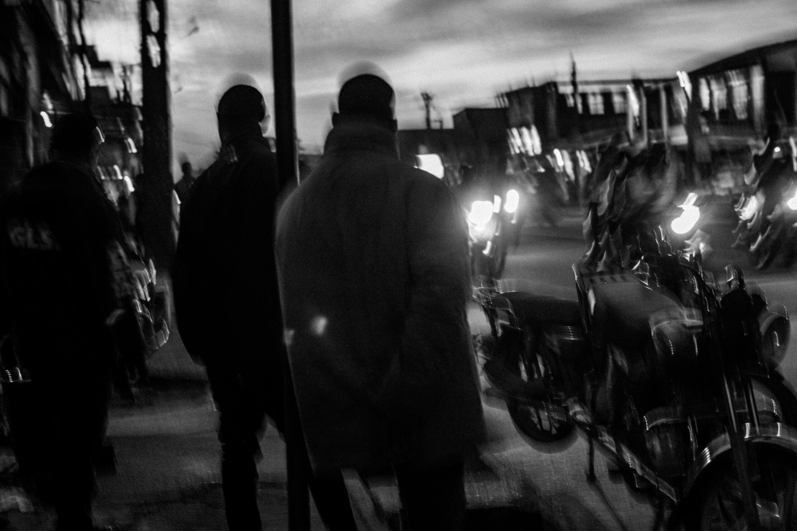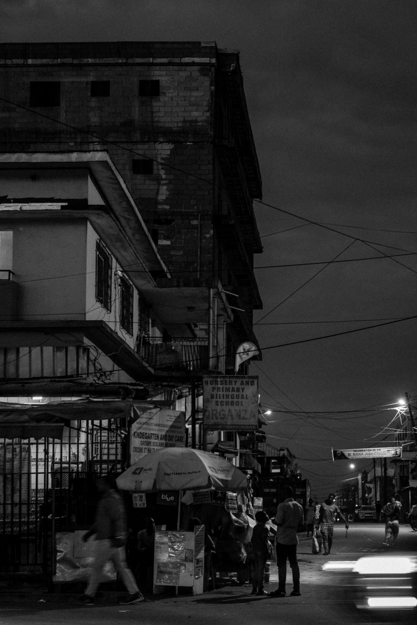 Les veines nocturnes, ce sont ces instants où tout vacille entre réalisme et abstraction. Le flou des mouvements raconte la vitesse et la fatigue, la lumière brutale révèle l’énergie de la nuit, et les ombres épaisses suggèrent la part invisible de la ville. Tel est le quotidien nocturne de Douala — vibrant, chaotique, mais toujours habité d’une mélancolie discrète.